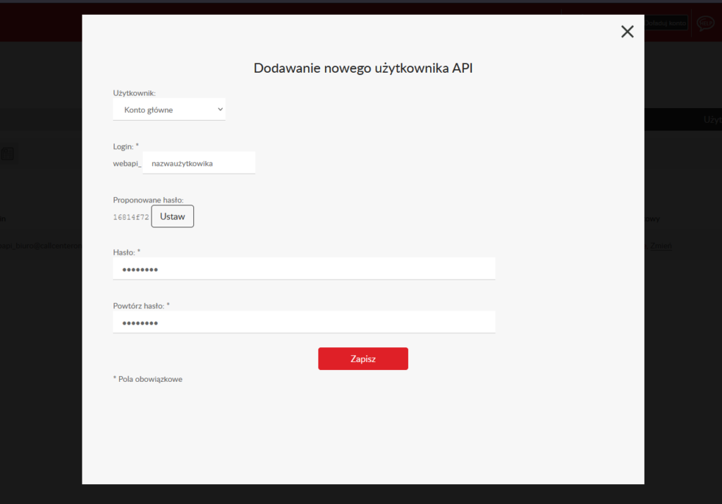 W oknie formularza należy uzupełnić pola (dane będą potrzebne przy dalszej konfiguracji w systemie Call Center Online) i nacisnąć przycisk Zapisz