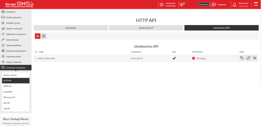 Następnie należy wejść w Ustawienia interfejsów > HTTP API i nacisnąć czerwony przycisk z plusem