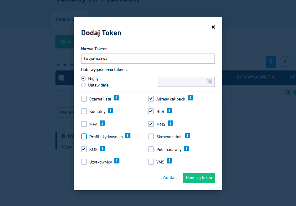 Następnie należy wejść w Ustawienia API > Tokeny API (OAuth) i nacisnąć przycisk Generuj token