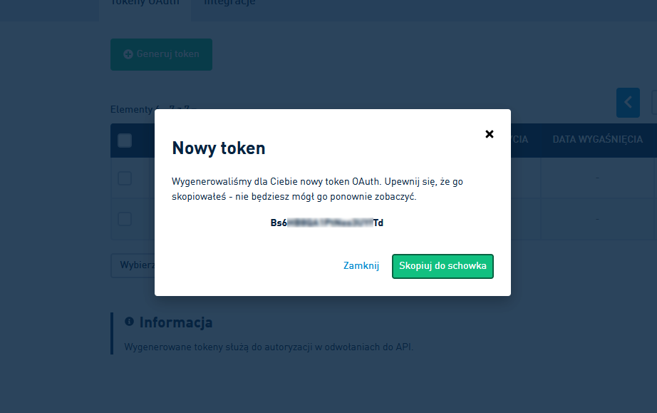 Nie będzie możliwości wyświetlenia Tokena później. Konieczne jest skopiowanie go od razu po wygenerowaniu i zapisanie w notatniku.