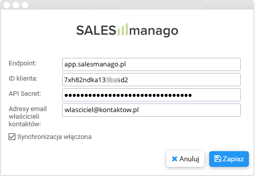 W oprogramowaniu Call Center Online logujemy się na konto z uprawnieniami do zarządzania i w Panelu Administracyjnym wybieramy opcję Ustawienia a następnie Integracje. Na liście dostępnych w systemie integracji wybieramy wiersz SALESmamago i wprowadzamy zebrane wcześniej parametry. Aktywujemy opcję synchronizacji i zapisujemy ustawienia.